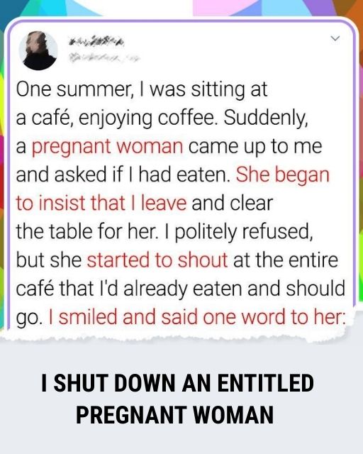 “Well, you need to leave,” she stated, not asked. “I’m pregnant, and I need this table.” I politely told her I was sorry, but I wasn’t ready to go just yet. That’s when she completely lost it. She started shouting, loud enough for the entire patio to hear, that I was a selfish person who had clearly finished my meal and was refusing to give up a seat for a pregnant woman in need.