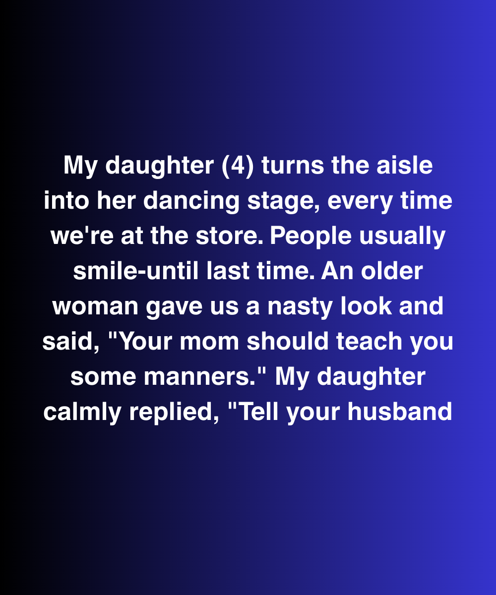 My daughter (4) turns the aisle into her dancing stage, every time we’re at the store. People usually smile—until last time. An older woman gave us a nasty look and said, “Your mom should teach you some manners.” My daughter calmly replied, “Tell your husband.”
