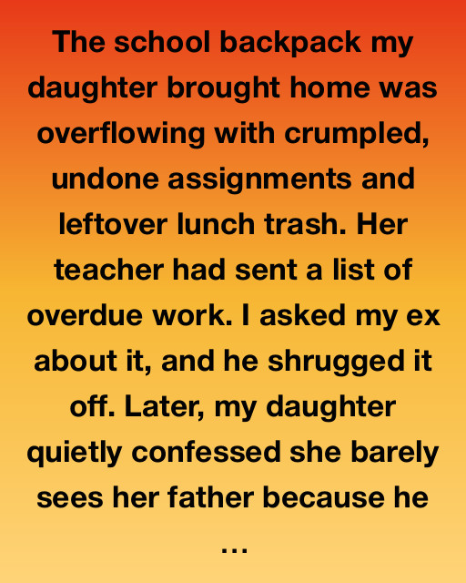 The school backpack my daughter brought home was overflowing with crumpled, undone assignments and leftover lunch trash. Her teacher had sent a list of overdue work. I asked my ex about it, and he shrugged it off. Later, my daughter quietly confessed she barely sees her father because he works late every night, leaving her at the neighbor’s after school.