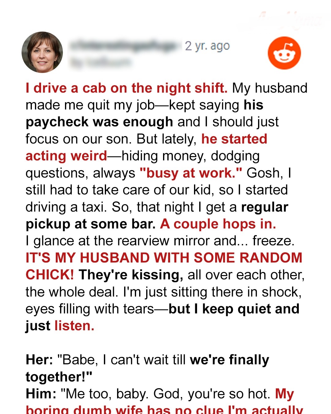 I drive a cab on the night shift. My husband made me quit my job—kept saying his paycheck was enough and I should just focus on our son. But lately, he started acting weird—hiding money, dodging questions, always “busy at work.” Gosh, I still had to take care of our kid, so I started driving a taxi.