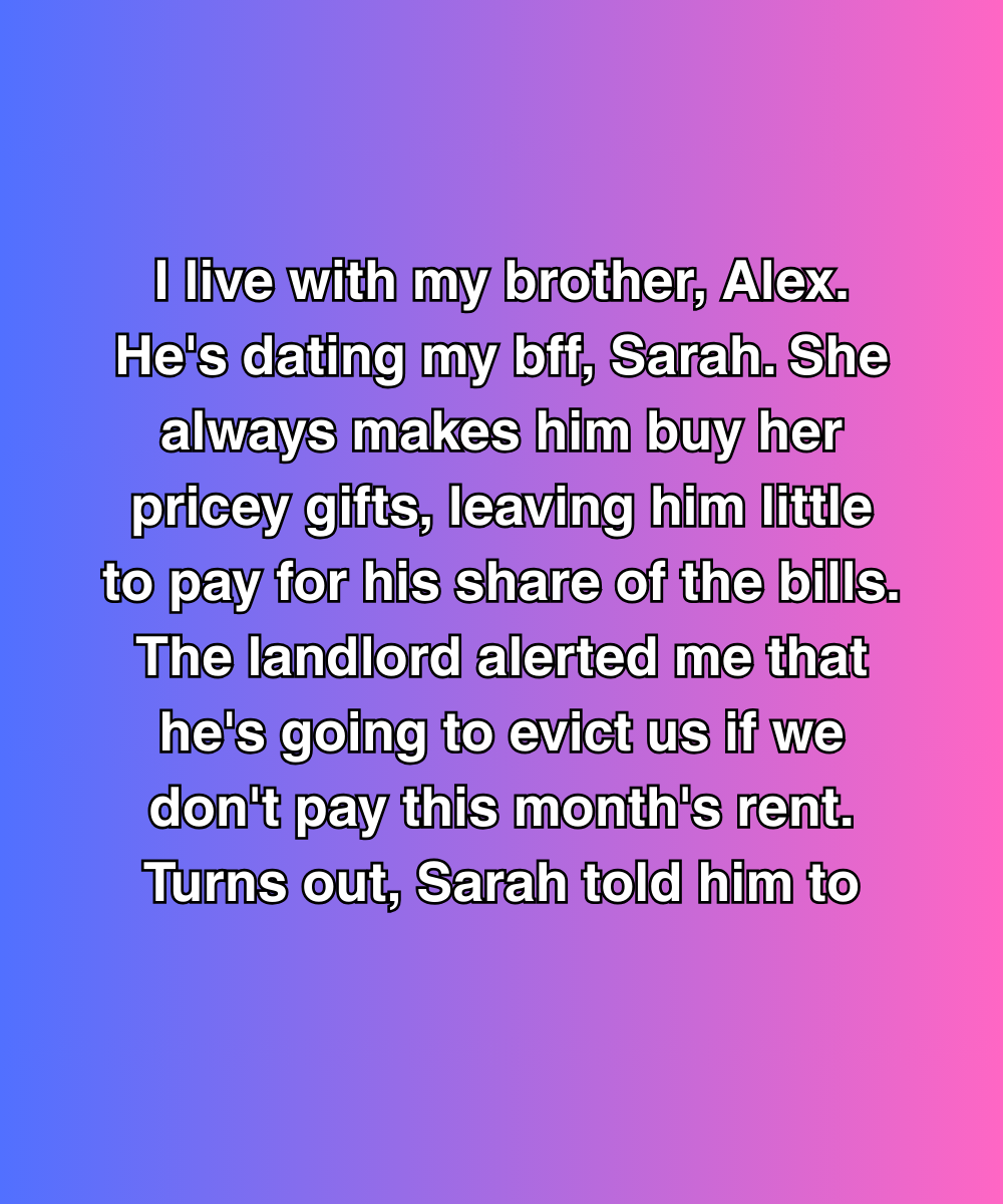 I live with my brother, Alex. He’s dating my bff, Sarah. She always makes him buy her pricey gifts, leaving him little to pay for his share of the bills. The landlord alerted me that he’s going to evict us if we don’t pay this month’s rent. Turns out, Sarah told him to.