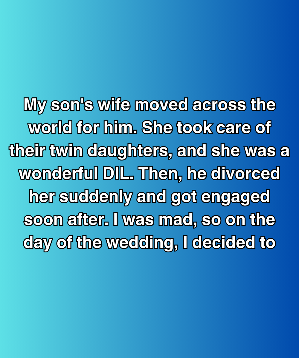 My son’s wife moved across the world for him. She took care of their twin daughters, and she was a wonderful DIL. Then, he divorced her suddenly and got engaged soon after. I was mad, so on the day of the wedding, I decided to wear white. Full white. Floor-length. Lacy sleeves. Not subtle at all. The new bride gasped when she saw me.