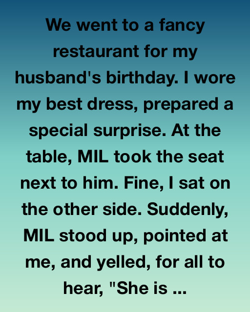 We went to a fancy restaurant for my husband’s birthday. I wore my best dress, prepared a special surprise. At the table, MIL took the seat next to him. Fine, I sat on the other side. Suddenly, MIL stood up, pointed at me, and yelled, for all to hear, “She is…”