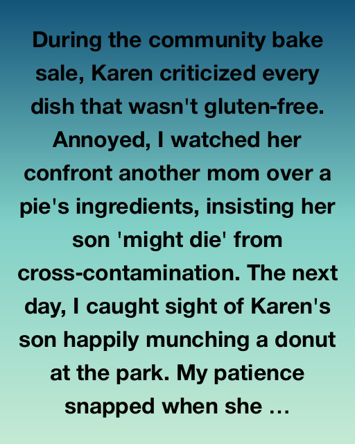 During the community bake sale, Karen criticized every dish that wasn’t gluten-free. Annoyed, I watched her confront another mom over a pie’s ingredients, insisting her son ‘might die’ from cross-contamination. The next day, I caught sight of Karen’s son happily munching a donut at the park. My patience snapped when she approached me.