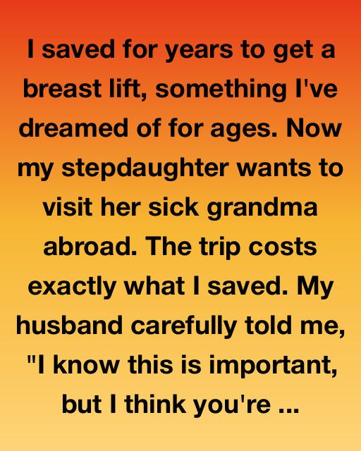 I saved for years to get a breast lift, something I’ve dreamed of for ages. Now my stepdaughter wants to visit her sick grandma abroad. The trip costs exactly what I saved. My husband carefully told me, “I know this is important, but I think you’re going to want to hear her out first.”