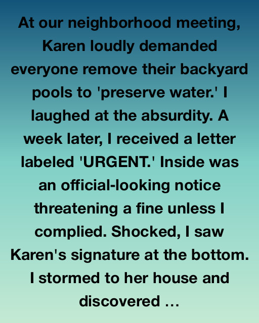 At our neighborhood meeting, Karen loudly demanded everyone remove their backyard pools to ‘preserve water.’ I laughed at the absurdity. A week later, I received a letter labeled ‘URGENT.’ Inside was an official‑looking notice threatening a fine unless I complied. Shocked, I saw Karen’s signature at the bottom. I stormed to her house and discovered the door slightly ajar, as she busied herself with numerous papers scattered across her dining table.