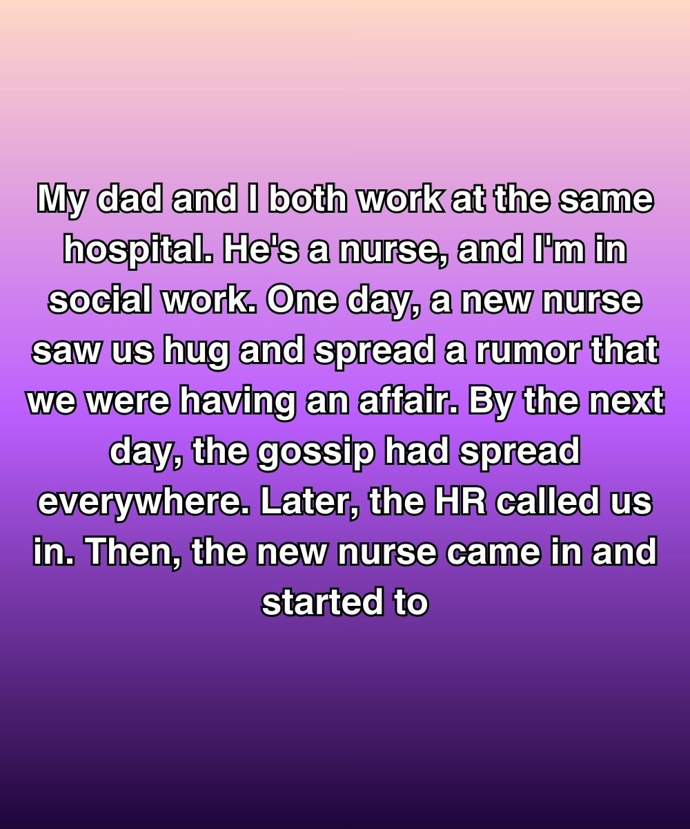 My dad and I both work at the same hospital. He’s a nurse, and I’m in social work. One day, a new nurse saw us hug and spread a rumor that we were having an affair. By the next day, the gossip had spread everywhere. Later, the HR called us in. Then, the new nurse came in and started to cry.