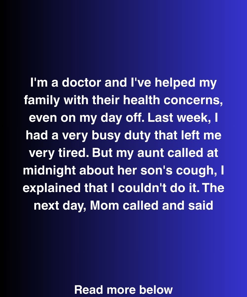 I’m a doctor and I’ve helped my family with their health concerns, even on my day off. Last week, I had a very busy duty that left me very tired. But my aunt called at midnight about her son’s cough, I explained that I couldn’t do it. The next day, Mom called and said, “You’ve changed, Leena. After everything we’ve done for you.”