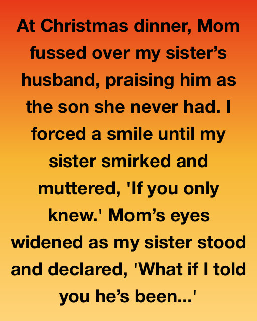 At Christmas dinner, Mom fussed over my sisterโ€™s husband, praising him as the son she never had. I forced a smile until my sister smirked and muttered, ‘If you only knew.’ Momโ€™s eyes widened as my sister stood and declared, ‘What if I told you heโ€™s been seeing someone else?’ The room went silent, except for the ticking clock that seemed louder than ever.