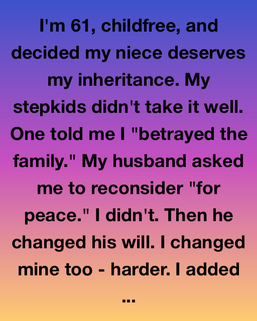 I’m 61, childfree, and decided my niece deserves my inheritance. My stepkids didn’t take it well. One told me I ‘betrayed the family.’ My husband asked me to reconsider ‘for peace.’ I didn’t. Then he changed his will. I changed mine too – harder. I added a clause that not only leaves everything to my niece, but disinherits anyone who contests it.