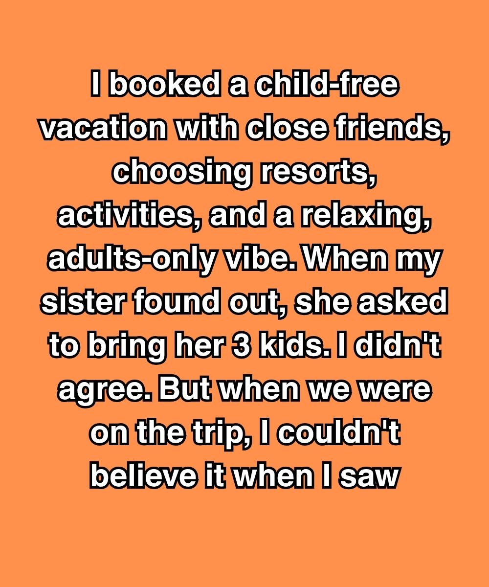 I booked a child-free vacation with close friends, choosing resorts, activities, and a relaxing, adults-only vibe. When my sister found out, she asked to bring her 3 kids. I didn’t agree. But when we were on the trip, I couldn’t believe it when I saw her walking across the hotel lobby… with all three of them.