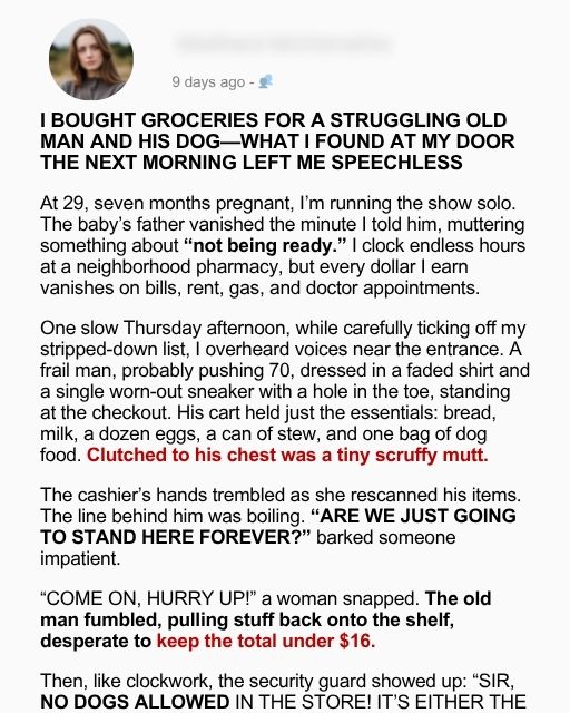 The old man’s watery blue eyes widened. His lips trembled like he was about to argue, but no words came. The mutt wagged its tail and looked straight at me like it understood. The cashier, relieved, scanned everything quickly while the line behind us sighed and muttered.