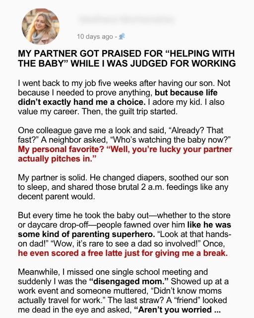 But here’s the thing—I didn’t need the praise anymore. Because by then, I had realized something important. The applause my partner got wasn’t about him at all. It was about the low bar society sets for fathers and the impossible bar it sets for mothers.