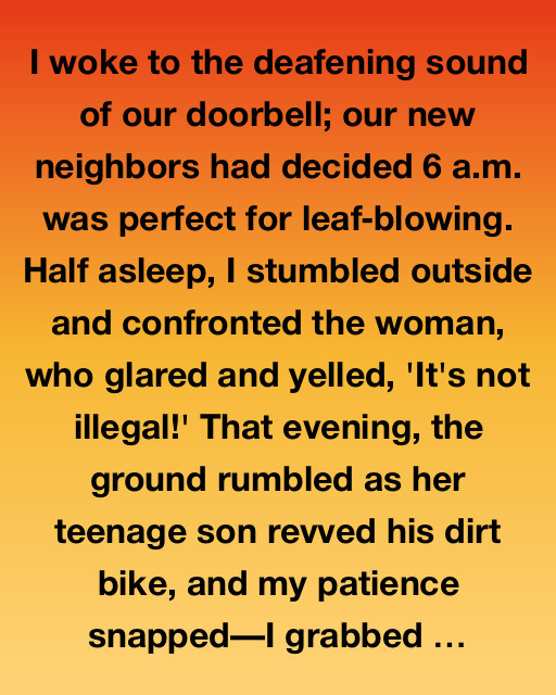 I woke to the deafening sound of our doorbell; our new neighbors had decided 6 a.m. was perfect for leaf-blowing. Half asleep, I stumbled outside and confronted the woman, who glared and yelled, ‘It’s not illegal!’ That evening, the ground rumbled as her teenage son revved his dirt bike, and my patience snappedโI grabbed my robe tighter as I stepped toward the fence separating our yards.