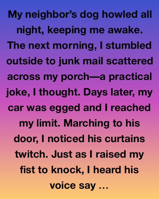 My neighbor’s dog howled all night, keeping me awake. The next morning, I stumbled outside to junk mail scattered across my porch—a practical joke, I thought. Days later, my car was egged and I reached my limit. Marching to his door, I noticed his curtains twitch. Just as I raised my fist to knock, I heard his voice say, “I can’t handle this anymore!”
