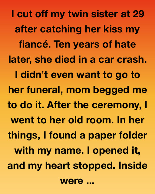 I cut off my twin sister at 29 after catching her kiss my fiancรฉ. Ten years of hate later, she died in a car crash. I didn’t even want to go to her funeral, mom begged me to do it. After the ceremony, I went to her old room. In her things, I found a paper folder with my name. I opened it, and my heart stopped. Inside were handwritten letters. Dozens of them. All addressed to me.
