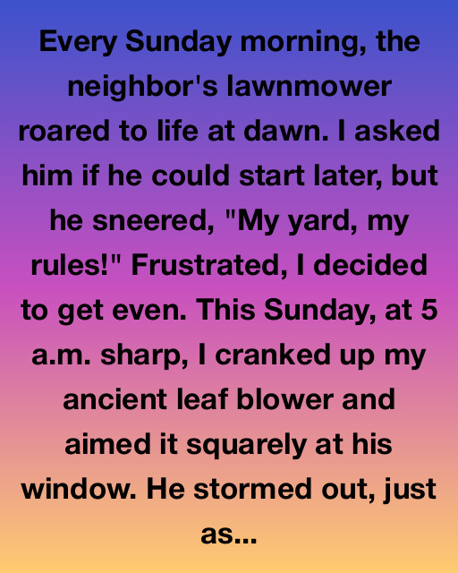 Every Sunday morning, the neighbor’s lawnmower roared to life at dawn. I asked him if he could start later, but he sneered, “My yard, my rules!” Frustrated, I decided to get even. This Sunday, at 5 a.m. sharp, I cranked up my ancient leaf blower and aimed it squarely at his window. He stormed out, just as the first rays of sunlight stretched over the horizon, his face a mix of fury and disbelief.