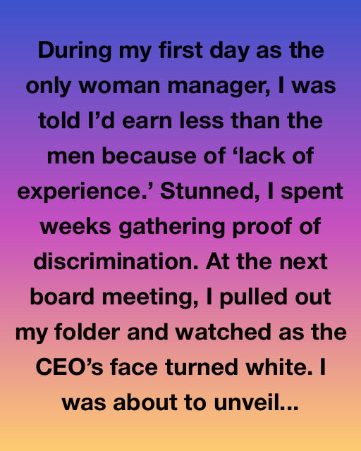 During my first day as the only woman manager, I was told I’d earn less than the men because of ‘lack of experience.’ Stunned, I spent weeks gathering proof of discrimination. At the next board meeting, I pulled out my folder and watched as the CEOโs face turned white. I was about to unveil evidence that challenged deeply rooted biases within our firm.