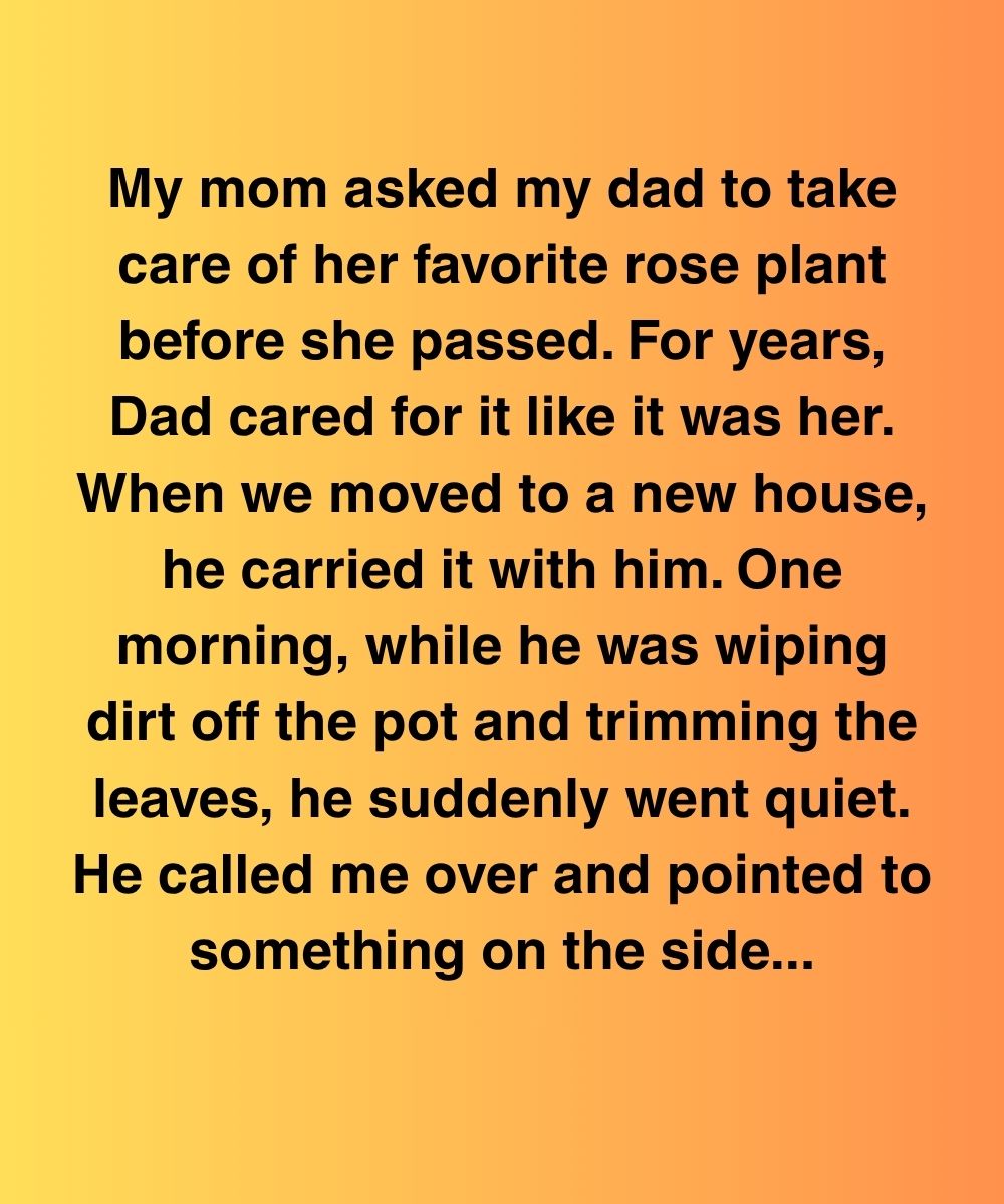 My mom asked my dad to take care of her favorite rose plant before she passed. For years, Dad cared for it like it was her. When we moved to a new house, he carried it with him. One morning, while he was wiping dirt off the pot and trimming the leaves, he suddenly went quiet. He called me over and pointed to something on the side.