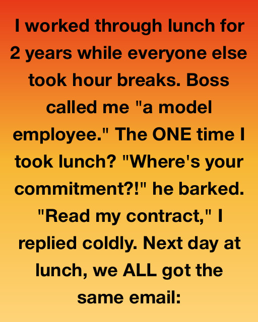 I worked through lunch for 2 years while everyone else took hour breaks. The boss called me “a model employee.” The ONE time I took lunch? “Where’s your commitment?!” he barked. “Read my contract,” I replied coldly. The next day at lunch, we ALL got the same email: