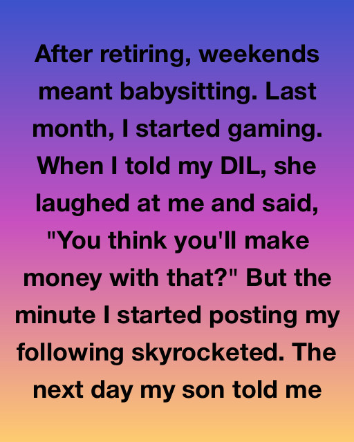 After retiring, weekends meant babysitting. Last month, I started gaming. When I told my DIL, she laughed at me and said, “You think you’ll make money with that?” But the minute I started posting my following skyrocketed. The next day my son told me “Mom, you didn’t go viral because you’re good at the game. You went viral because your hands are transmitting a cipher, and the people watching are not fansโthey are corporate analysts trying to break your code.”