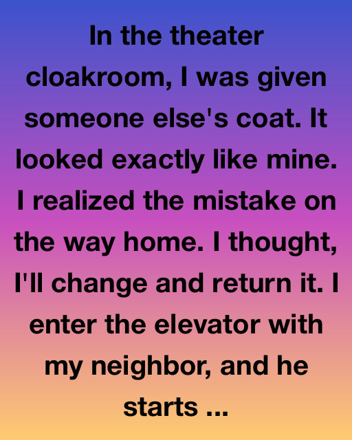 In the theater cloakroom, I was given someone else’s coat. It looked exactly like mine. I realized the mistake on the way home. I thought, I’ll change and return it. I enter the elevator with my neighbor, and he starts staring at the coat.