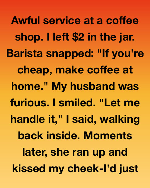 Awful service at a coffee shop. I left $2 in the jar. Barista snapped: “If you’re cheap, make coffee at home.” My husband was furious. I smiled. “Let me handle it,” I said, walking back inside. Moments later, she ran up and kissed my cheekโIโd just paid off the shopโs overdue utility bill, solving the immediate crisis that was ruining her life and her attitude.