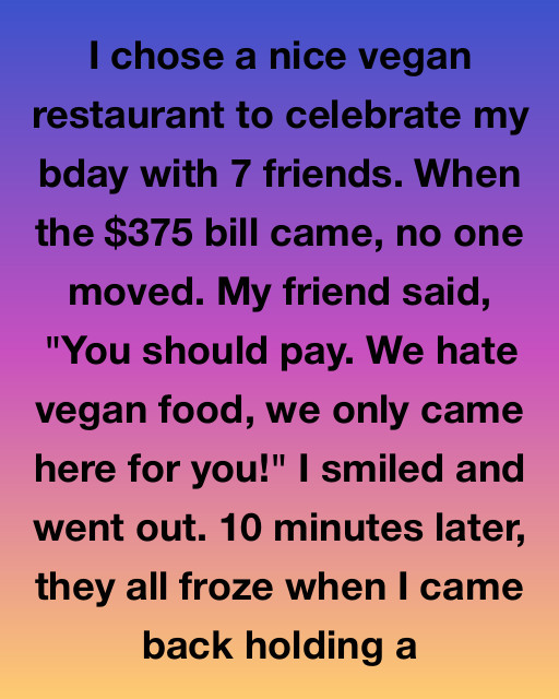 I chose a nice vegan restaurant to celebrate my bday with 7 friends. When the $375 bill came, no one moved. My friend said, “You should pay. We hate vegan food, we only came here for you!” I smiled and went out. 10 minutes later, they all froze when I came back holding a waiter by the arm.