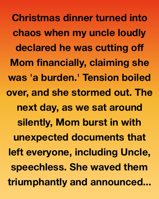 Christmas dinner turned into chaos when my uncle loudly declared he was cutting off Mom financially, claiming she was ‘a burden.’ Tension boiled over, and she stormed out. The next day, as we sat around silently, Mom burst in with unexpected documents that left everyone, including Uncle, speechless. She waved them triumphantly and announced she had inherited a substantial trust fund from an old family friend. The news came as a shock, settling quickly into a mix of disbelief and curiosity.