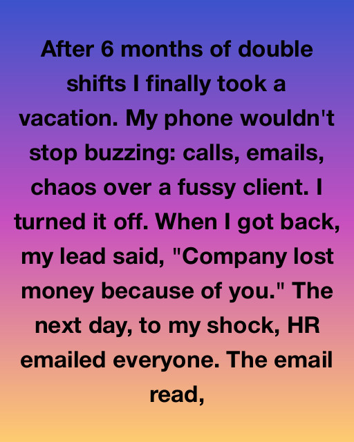 I sat at my desk, trying to swallow the humiliation. Iโ€™d put in more hours than half the team combined. Stayed late. Skipped birthdays. Canceled dates. And this was the thanks?