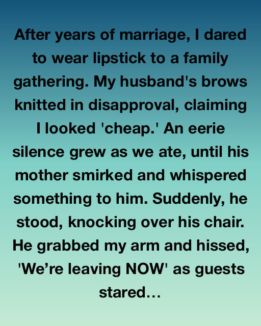 After years of marriage, I dared to wear lipstick to a family gathering. My husband’s brows knitted in disapproval, claiming I looked ‘cheap.’ An eerie silence grew as we ate, until his mother smirked and whispered something to him. Suddenly, he stood, knocking over his chair. He grabbed my arm and hissed, ‘Weโre leaving NOW’ as guests stared.