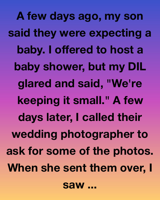 A few days ago, my son said they were expecting a baby. I offered to host a baby shower, but my DIL glared and said, “We’re keeping it small.” A few days later, I called their wedding photographer to ask for some of the photos. When she sent them over, I saw something that made my heart stop.