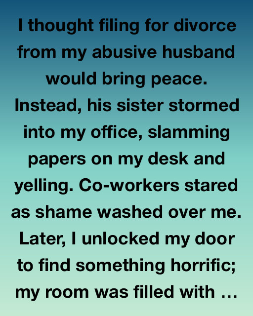 I thought filing for divorce from my abusive husband would bring peace. Instead, his sister stormed into my office, slamming papers on my desk and yelling. Co-workers stared as shame washed over me. Later, I unlocked my door to find something horrific; my room was filled with shredded clothes and broken frames.