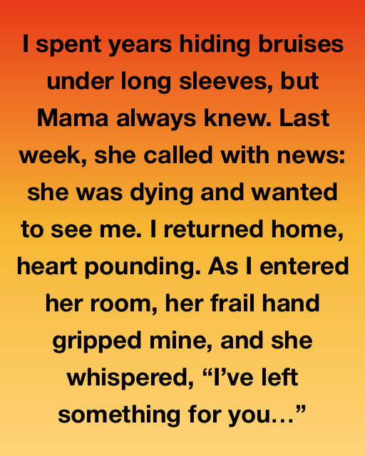 I spent years hiding bruises under long sleeves, but Mama always knew. Last week, she called with news: she was dying and wanted to see me. I returned home, heart pounding. As I entered her room, her frail hand gripped mine, and she whispered, โIโve left something for youโฆโ