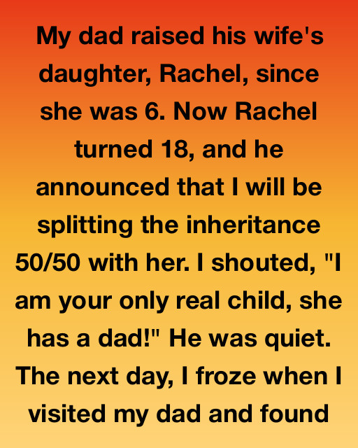 He announced that I will be splitting the inheritance 50/50 with her. He spoke simply, stating that all his accumulated assetsโthe house, the savings, and the small business he ownedโwould be divided equally between Rachel and me upon his passing. The news landed on me like a physical punch, immediately confirming my worst fears about my own diminished importance in his eyes.