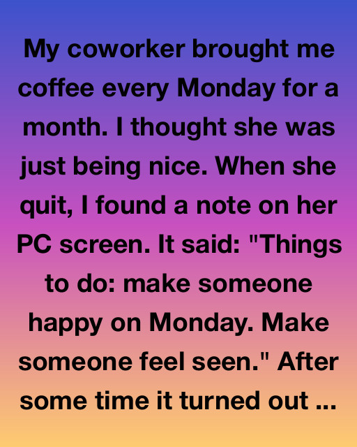 My coworker brought me coffee every Monday for a month. I thought she was just being nice. When she quit, I found a note on her PC screen. It said: “Things to do: make someone happy on Monday. Make someone feel seen.” After some time it turned out that simple gesture had started something I never expected.