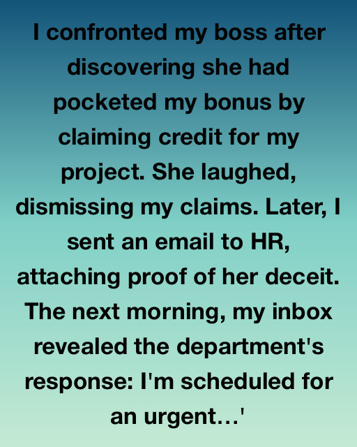 I confronted my boss after discovering she had pocketed my bonus by claiming credit for my project. She laughed, dismissing my claims. Later, I sent an email to HR, attaching proof of her deceit. The next morning, my inbox revealed the department’s response: I’m scheduled for an urgent meeting with the HR manager at 10 AM.