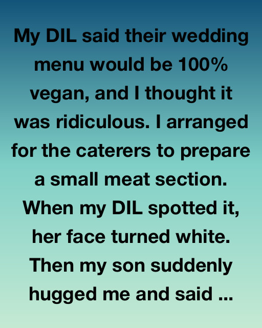 My DIL said their wedding menu would be 100% vegan, and I thought it was ridiculous. I arranged for the caterers to prepare a small meat section. When my DIL spotted it, her face turned white. Then my son suddenly hugged me and said, ‘Thank you for trying, Mom. But this isnโ€™t the time.’