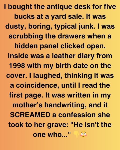 I bought the antique desk for five bucks at a yard sale. It was dusty, boring, typical junk. I was scrubbing the drawers when a hidden panel clicked open. Inside was a leather diary from 1998 with my birth date on the cover.