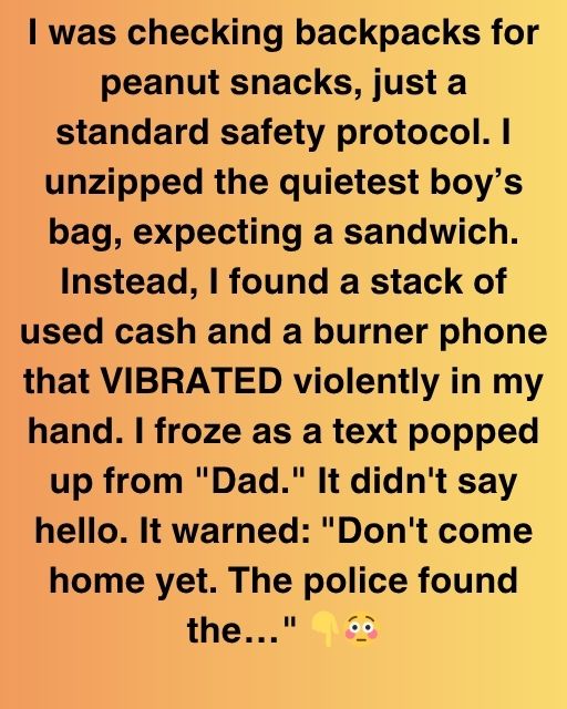 I was checking backpacks for peanut snacks, just a standard safety protocol. I unzipped the quietest boyโs bag, expecting a sandwich. Instead, I found a stack of used cash and a burner phone that VIBRATED violently in my hand.