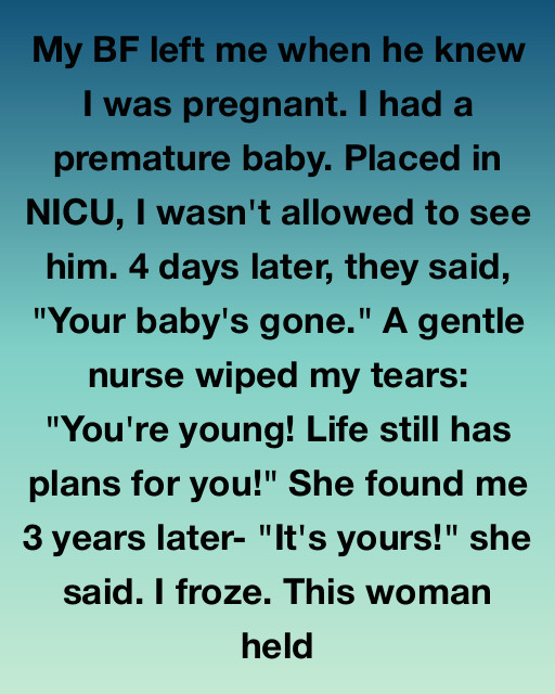 My BF left me when he knew I was pregnant. I had a premature baby. Placed in NICU, I wasn’t allowed to see him. 4 days later, they said, ‘Your baby’s gone.’ A gentle nurse wiped my tears: ‘You’re young! Life still has plans for you!’ She found me 3 years later—’It’s yours!’ she said. I froze. This woman held my baby.”