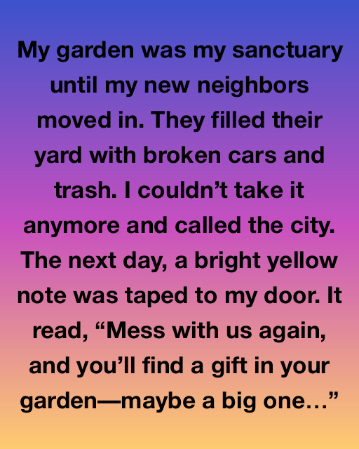 My garden was my sanctuary until my new neighbors moved in. They filled their yard with broken cars and trash. I couldnโ€™t take it anymore and called the city. The next day, a bright yellow note was taped to my door. It read, โ€œMess with us again, and youโ€™ll find a gift in your gardenโ€”maybe a big one…โ€