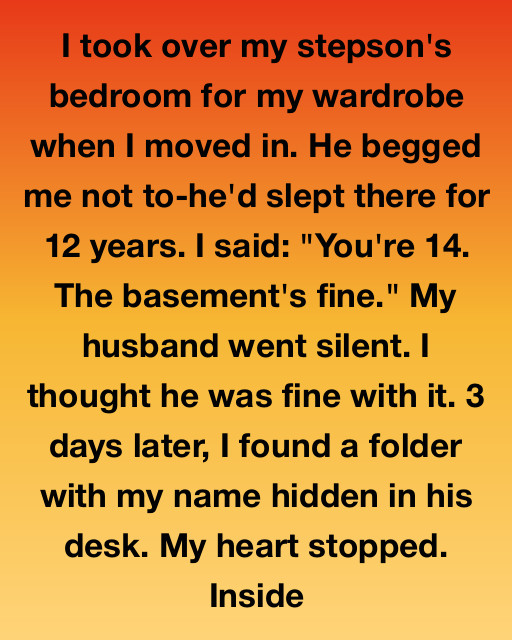 I was devastated, realizing my selfishness had put my stepson directly into a dangerous environment. I returned home immediately. I apologized to Mark for my paranoia and confessed my deep shame over the folder and the room. We spent hours talking about the trauma of loss and the fear of failure that defined both our lives.