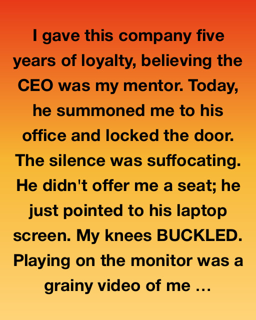 I gave this company five years of loyalty, believing the CEO was my mentor. Today, he summoned me to his office and locked the door. The silence was suffocating. He didn’t offer me a seat; he just pointed to his laptop screen. My knees BUCKLED. Playing on the monitor was a grainy video of me โฆ