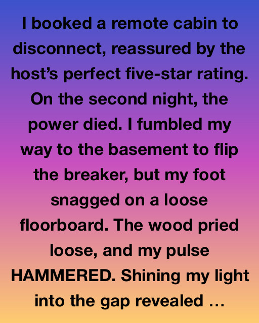I booked a remote cabin to disconnect, reassured by the hostโ€™s perfect five-star rating. On the second night, the power died. I fumbled my way to the basement to flip the breaker, but my foot snagged on a loose floorboard. The wood pried loose, and my pulse HAMMERED. Shining my light into the gap revealed โ€ฆ