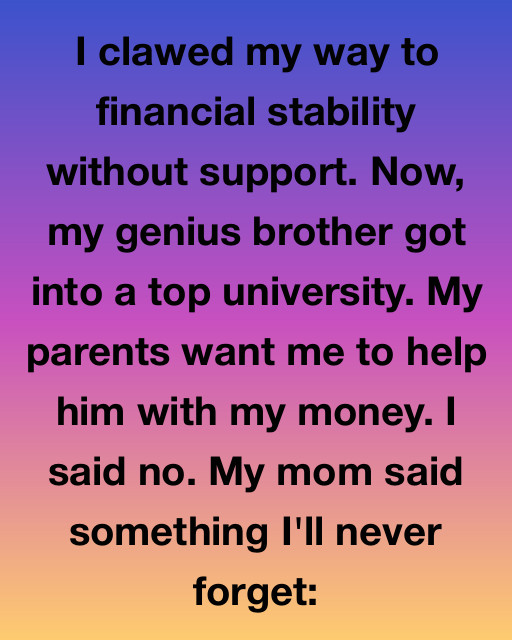 I clawed my way to financial stability without support. Now, my genius brother got into a top university. My parents want me to help him with my money. I said no. My mom said something I’ll never forget: