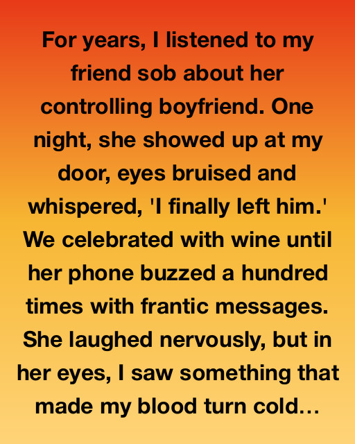 For years, I listened to my friend sob about her controlling boyfriend. One night, she showed up at my door, eyes bruised and whispered, ‘I finally left him.’ We celebrated with wine until her phone buzzed a hundred times with frantic messages. She laughed nervously, but in her eyes, I saw something that made my blood turn cold.