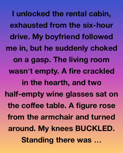 I unlocked the rental cabin, exhausted from the six-hour drive. My boyfriend followed me in, but he suddenly choked on a gasp. The living room wasn’t empty. A fire crackled in the hearth, and two half-empty wine glasses sat on the coffee table. A figure rose from the armchair and turned around. My knees BUCKLED. Standing there was my brother, Caleb.
