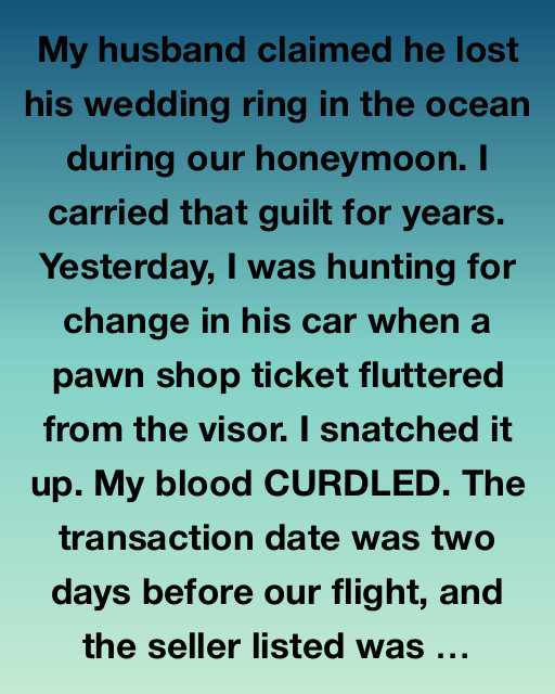 My husband claimed he lost his wedding ring in the ocean during our honeymoon. I carried that guilt for years. Yesterday, I was hunting for change in his car when a pawn shop ticket fluttered from the visor. I snatched it up. My blood CURDLED. The transaction date was two days before our flight, and the seller listed was Arthur Miller.