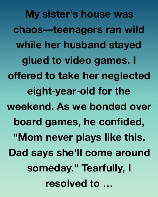 My sister’s house was chaosโteenagers ran wild while her husband stayed glued to video games. I offered to take her neglected eightโyearโold for the weekend. As we bonded over board games, he confided, “Mom never plays like this. Dad says she’ll come around someday.” Tearfully, I resolved to show him the importance of being loved and listened to.